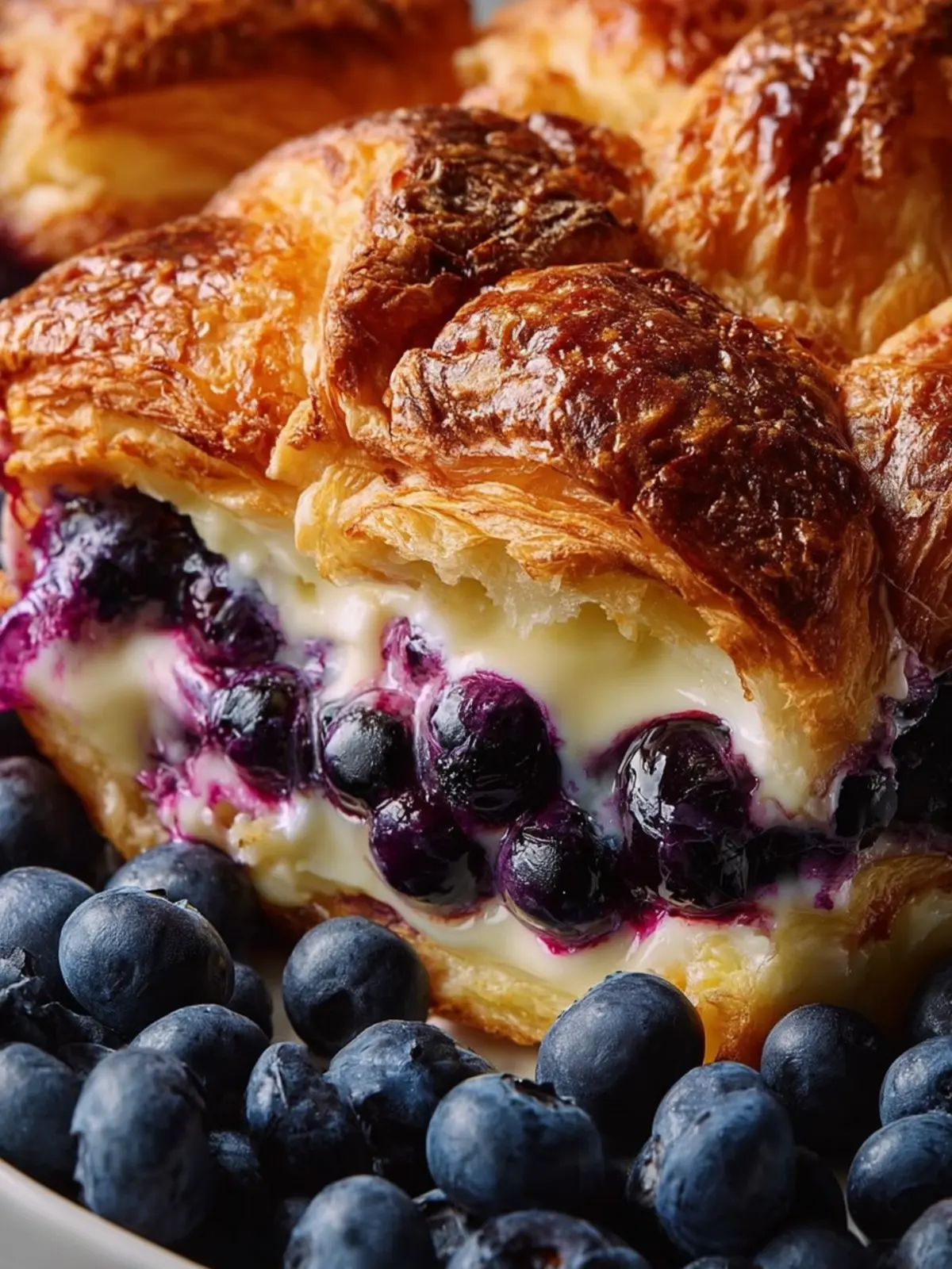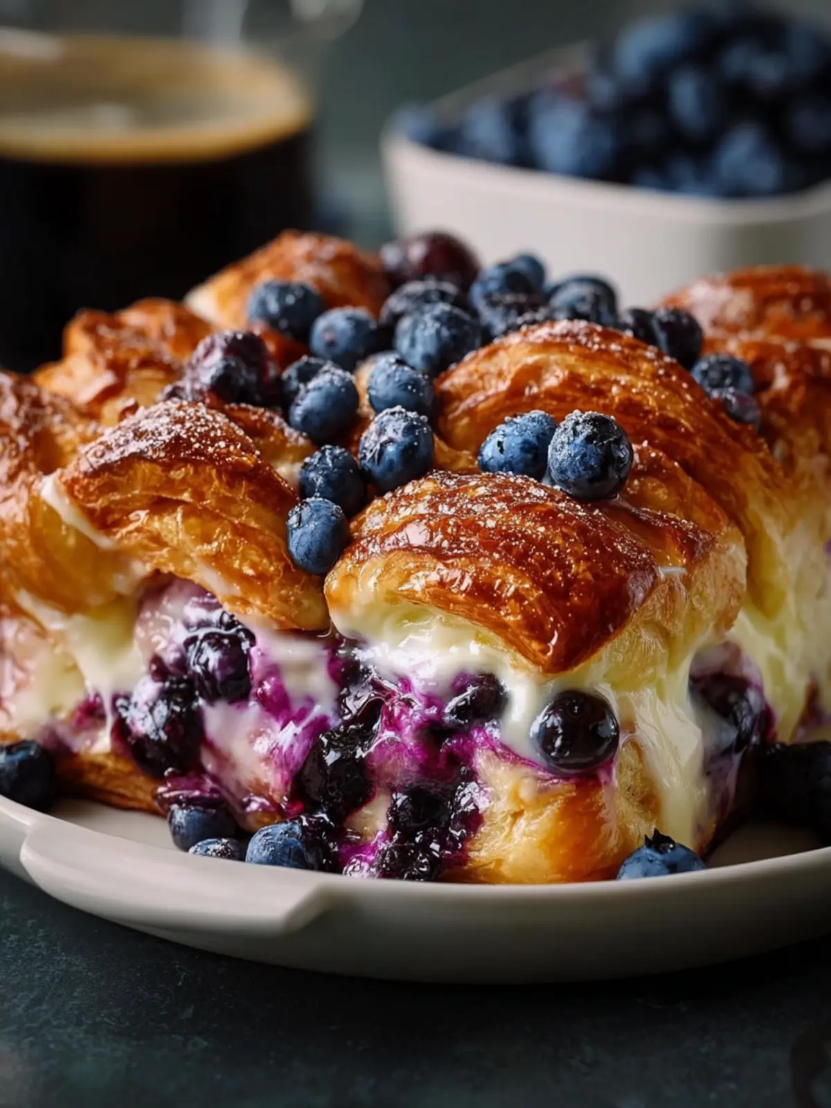 A delicious baked dish made with croissants, cream cheese, and fresh blueberries.