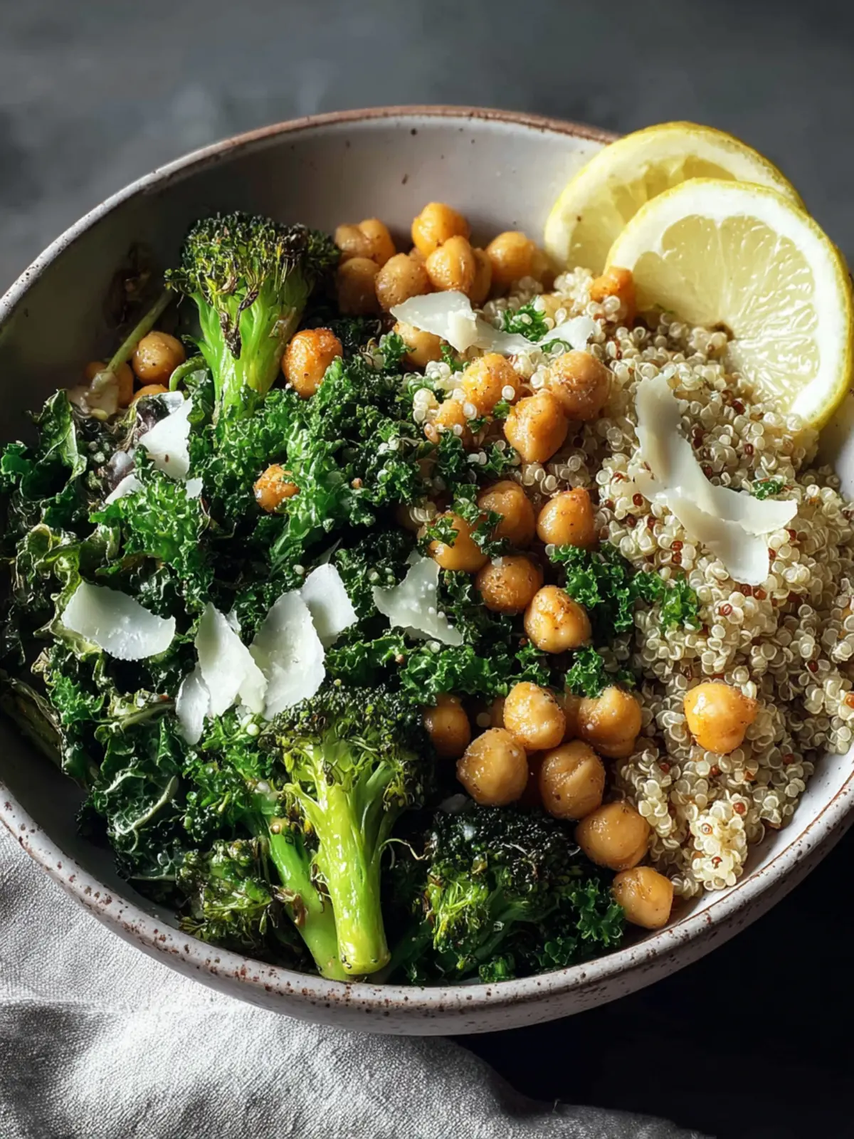 - Assemble by adding everything including the chopped kale, crispy chickpeas, broccoli, cooked quinoa, and parmesan to a large bowl or salad serving dish.