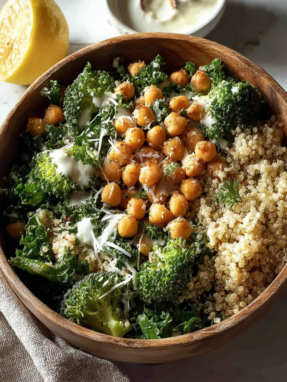 Instead of dumping all the ingredients together at once, layer them. Start with kale at the base, followed by quinoa, then chickpeas and broccoli. This not only looks appealing but ensures even seasoning throughout the salad.