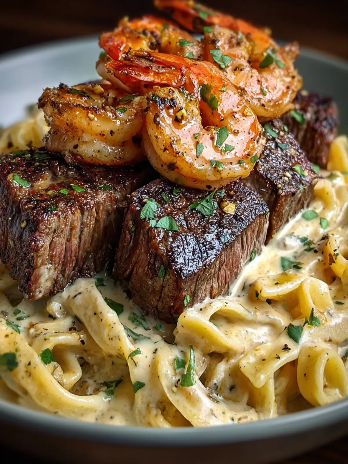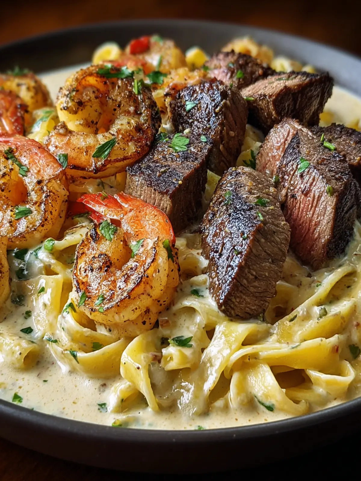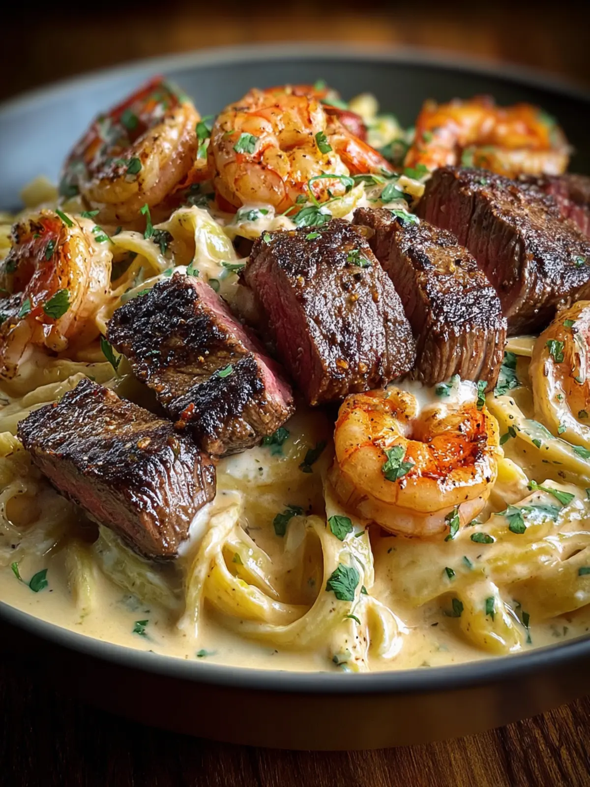 A hearty dish featuring fettuccine or linguine tossed in a creamy Alfredo sauce with seasoned shrimp and steak.