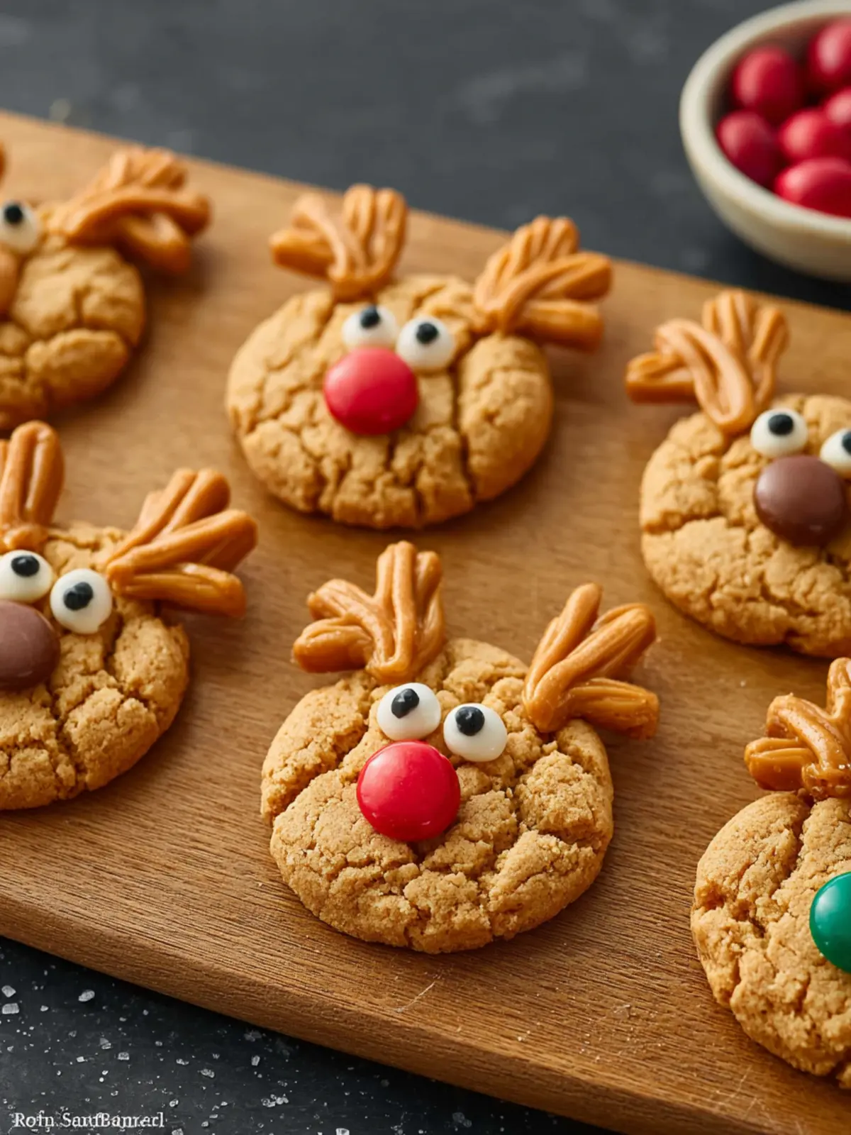 The fun part of making peanut butter reindeer cookies is decorating them. Use pretzels for antlers, chocolate candies for eyes, and a red candy for Rudolph’s nose. Let the kids help with this part—the creative possibilities are endless!
