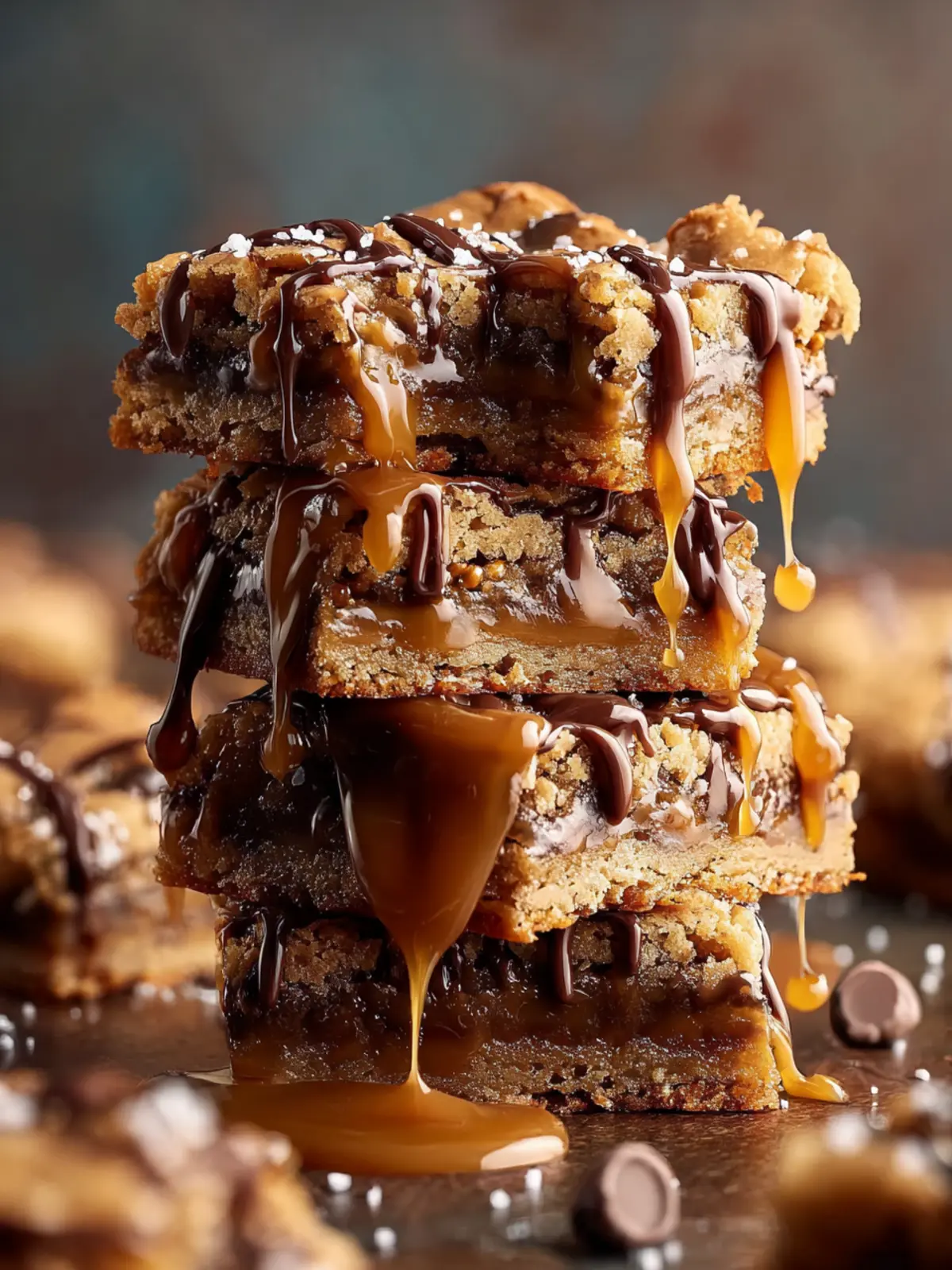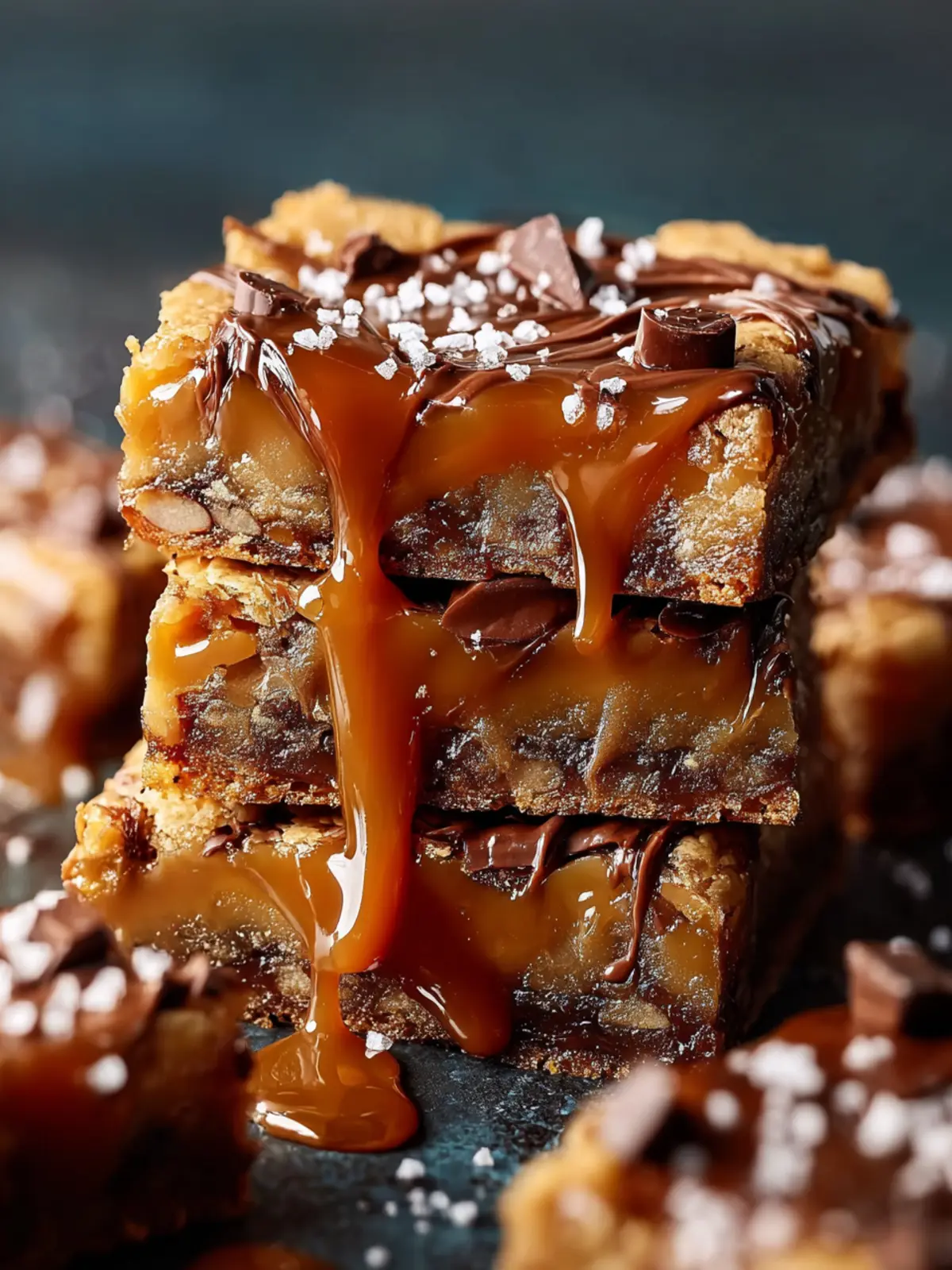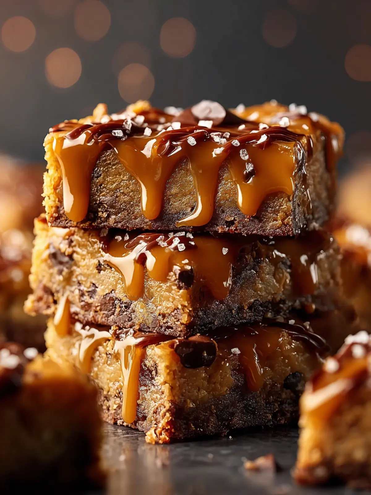 Indulge in these decadent blondies drizzled with homemade salted caramel sauce and topped with crunchy pretzels and chocolate chips.