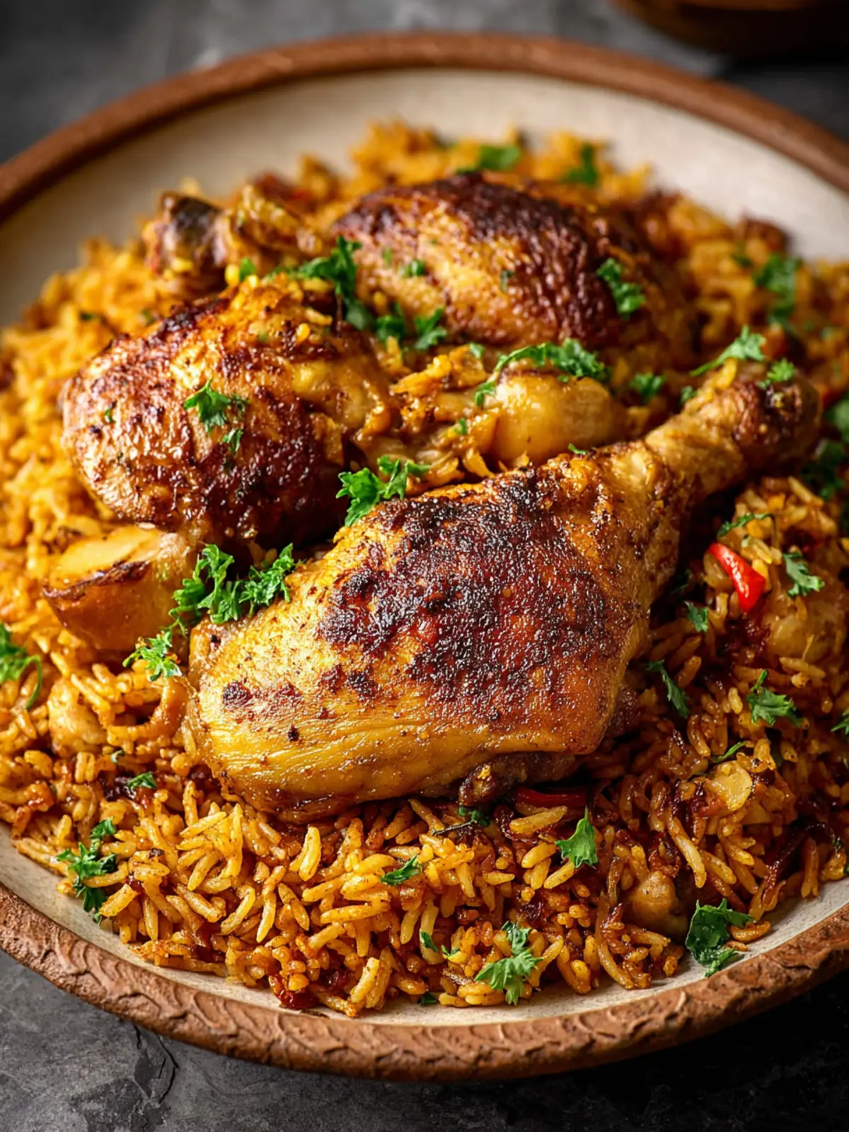 A delicious one-pot meal featuring tender chicken thighs, aromatic basmati rice, and a mix of spices.