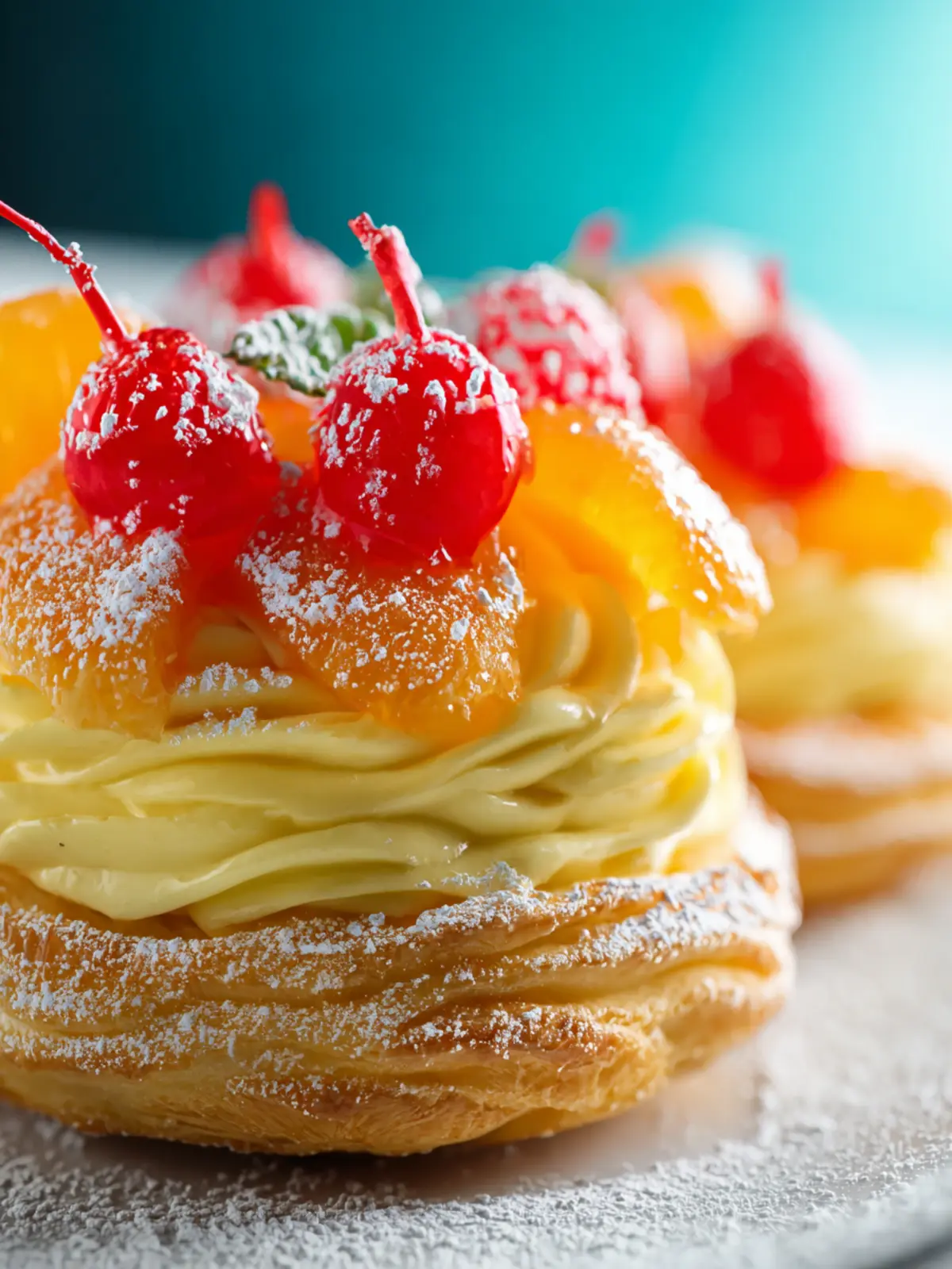 Delicious homemade choux pastry filled with a creamy custard and topped with powdered sugar and cherries.