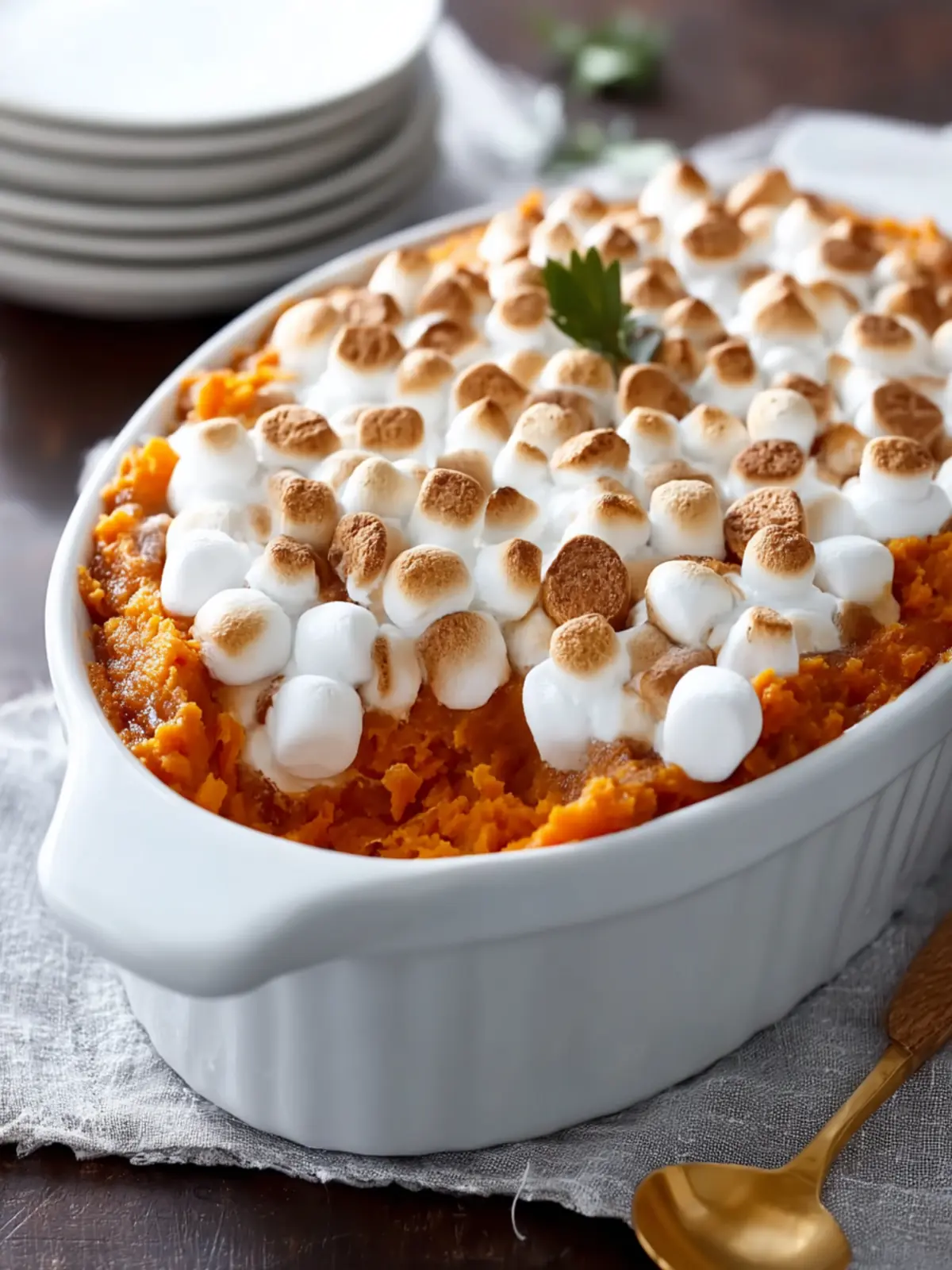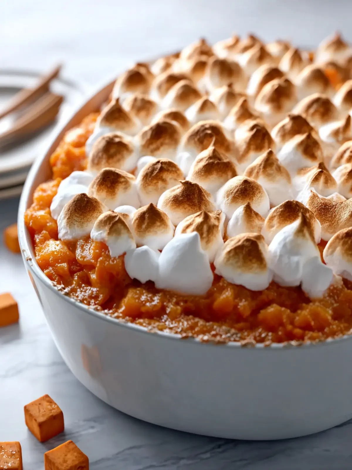 A delicious creamy sweet potato casserole topped with mini marshmallows.
