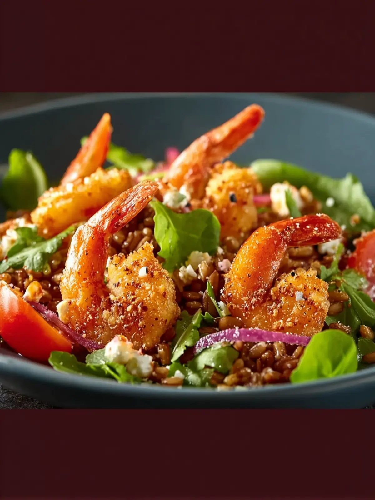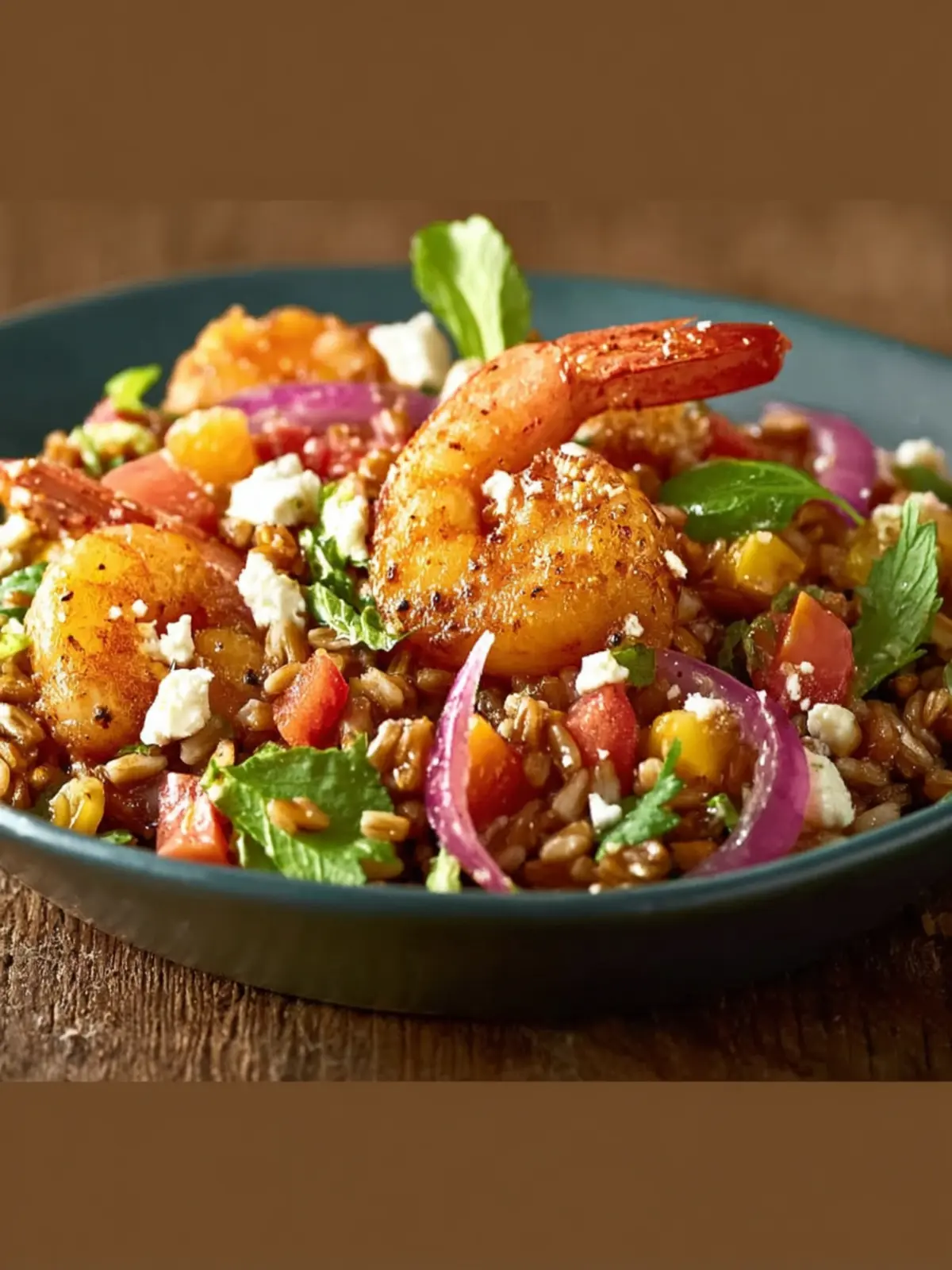 A refreshing salad combining sautéed shrimp with farro, cherry tomatoes, and fresh herbs, perfect for a light meal.
